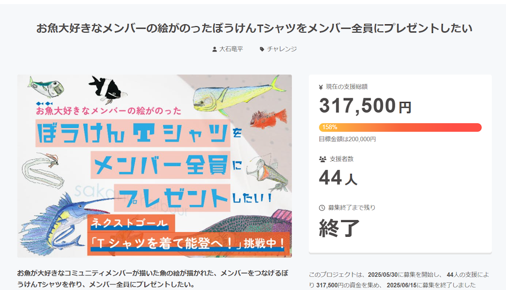 この度、クラウドファンディング「お魚が大好きなメンバーの絵がのった「ぼうけんTシャツを、メンバー全員にプレゼントしたい!」をさせていただき、多くの方々にご支援いただきました。目標金額20万円を達成でき、さらにネクストゴール30万円も達成することができました!